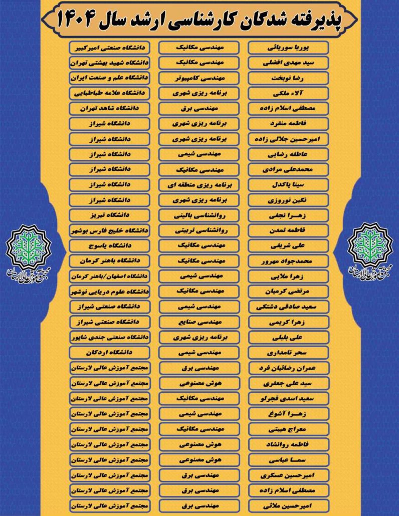 به گزارش روابط عمومی مجتمع آموزش عالی لارستان، نتایج آزمون سراسری کارشناسی ارشد سال ۱۴۰۴ حاکی از موفقیت چشمگیر دانشآموختگان مقطع کارشناسی این مجتمع است. این عزیزان موفق به پذیرش در مؤسسات آموزش عالی و دانشگاههای دولتی معتبر سراسر کشور شدهاند.